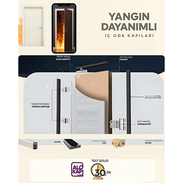Melamin Kaplama Yangın Kapısı – EI30 Sertifikalı Otel ve yurtlarınızın güvenliği artırmak için tasarlanmış EI30 yangın dayanımlı kapımız, hem sağlamlığı hem de estetik görünümüyle öne çıkıyor. Melamin kaplama sayesinde uzun yıllar çizilmelere ve darbeye karşı dayanıklılık sunar. Kapı seti içeriği: Yangın dayanımlı levha Fitiller Yönsüz menteşe Yangın Pedi kilit Yangın pedi menteşe Dirsek kollu kapatıcı Giyotin (kapı altı otomatik süpürgelik) Hariç tutulanlar: Kol ve kilit. Teknik Özellikler: Kanat: 46 mm Kasa: 42 mm Pervaz: 80 × 9 mm İsteğe göre özel ölçülerde üretim yapılabilmektedir. Fiyat standart kapı ölçüsü baz alınarak hesaplanmıştır. Yangın kapılarında duvar kalınlığı ölçüsü ve duvar ölçüsü sipariş aşamasında bildirilmelidir.